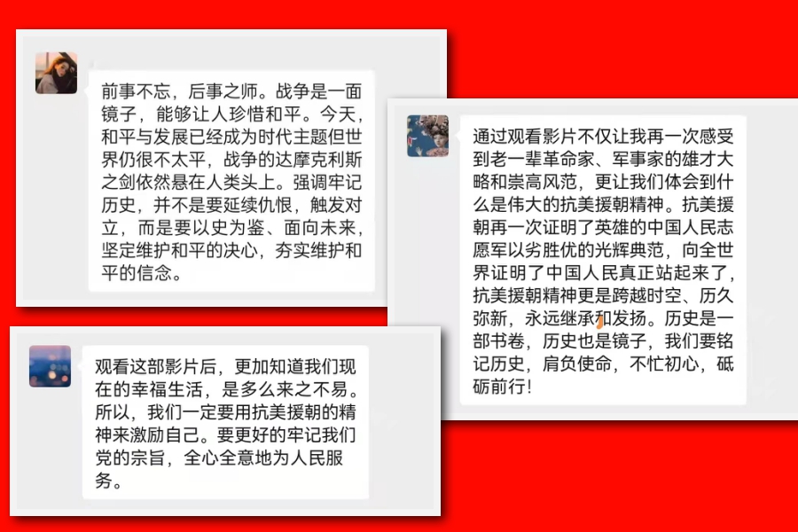 觀影過(guò)程中,大家聚精會(huì)神、專(zhuān)心致志,被片中的情節(jié)深深吸引,被志愿軍戰(zhàn)士的愛(ài)國(guó)主義精神、永不退縮的革命精神所感動(dòng),有的同志們邊看邊討論那些震撼場(chǎng)景和動(dòng)人畫(huà)面,有的甚至邊看邊擦拭著眼角的淚水。