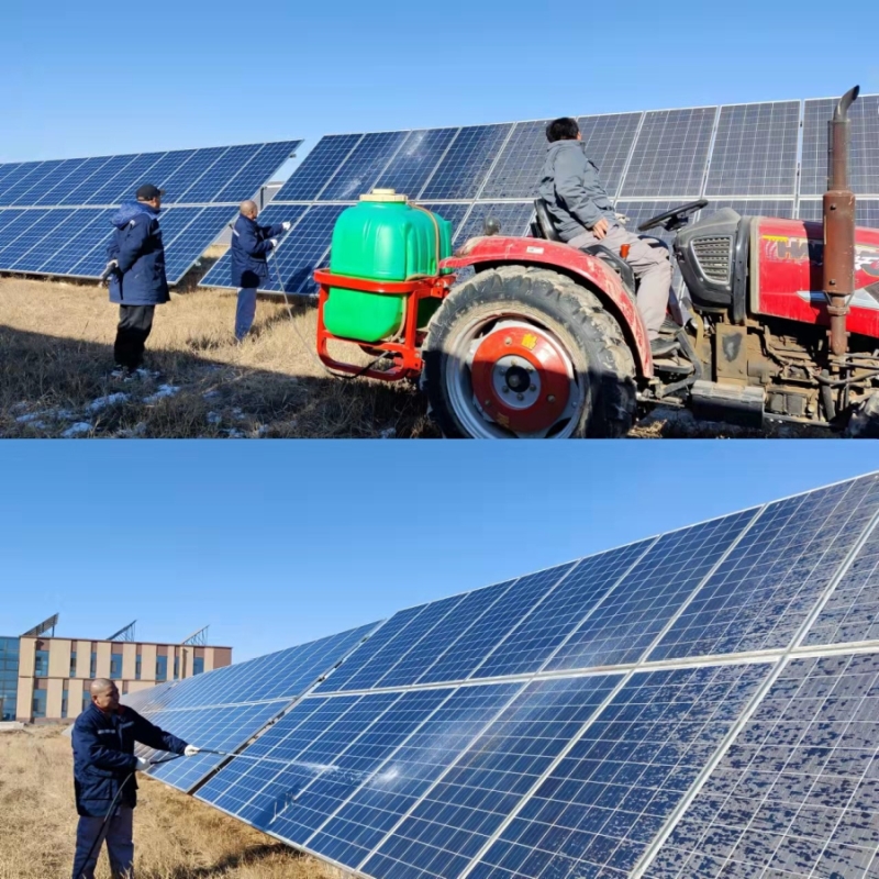 光伏電站在運行過程中,因自然環(huán)境及周圍環(huán)境對光伏組件表面造成污染,使得透光率降低,是導致系統(tǒng)發(fā)電效率降低的重要原因之一。外加今年冬季降雪少,灰塵堆積嚴重,發(fā)電效率明顯下降。針對以上情況,澤霖公司根據(jù)冬季實際情況認真部署、周密策劃,在明確各項清洗作業(yè)要求及安全注意事項前提下,分時段、分區(qū)域、分小組對廠區(qū)各方陣開展清洗工作。