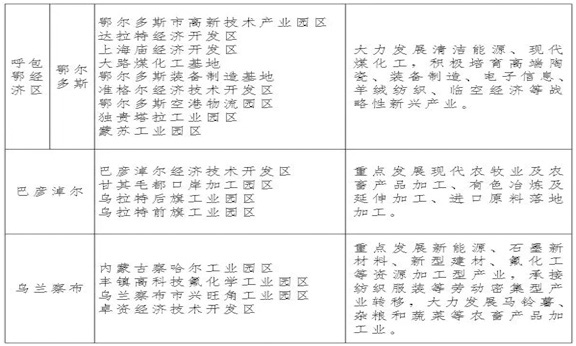 加快融入京津冀協(xié)同發(fā)展,以赤峰經(jīng)濟(jì)開(kāi)發(fā)區(qū)、察哈爾工業(yè)園區(qū)、興和縣物流園區(qū)為重點(diǎn)打造京津冀產(chǎn)業(yè)合作共建示范園區(qū),主動(dòng)承接北京制造業(yè)、商貿(mào)物流、云計(jì)算后臺(tái)服務(wù)等產(chǎn)業(yè)轉(zhuǎn)移。支持赤峰市打造京津冀協(xié)同發(fā)展產(chǎn)業(yè)合作與轉(zhuǎn)型升級(jí)示范區(qū)。創(chuàng)新與天津自貿(mào)區(qū)合作模式,共同在內(nèi)蒙古有條件的開(kāi)發(fā)區(qū)設(shè)立海關(guān)特殊監(jiān)管區(qū)域和保稅監(jiān)管場(chǎng)所。推動(dòng)蒙東地區(qū)主動(dòng)融入東北經(jīng)濟(jì)區(qū)發(fā)展,采取互換資源、共建園區(qū)、飛地經(jīng)濟(jì)等多種方式,加快推進(jìn)能源、裝備、科技、物流等產(chǎn)業(yè)互動(dòng)發(fā)展,構(gòu)建“錫赤朝錦萬(wàn)億元產(chǎn)業(yè)發(fā)展帶”。推進(jìn)蒙晉冀(烏大張)長(zhǎng)城金三角合作區(qū)建設(shè),以烏蘭察布市開(kāi)發(fā)區(qū)為主要載體,加強(qiáng)產(chǎn)業(yè)互補(bǔ)互促、資源要素對(duì)接等方面開(kāi)展實(shí)質(zhì)性合作。加快推進(jìn)區(qū)域合作,以鄂爾多斯上海廟能源基地、鄂爾多斯納林河工業(yè)園區(qū)、阿拉善騰格里經(jīng)濟(jì)開(kāi)發(fā)區(qū)為主要載體,加快與陜甘寧地區(qū)開(kāi)發(fā)區(qū)共同打造國(guó)家綜合能源基地、新型化工基地和戰(zhàn)略性新興產(chǎn)業(yè)基地。加強(qiáng)與長(zhǎng)三角、珠三角區(qū)域合作,落實(shí)《加快建設(shè)蒙蘇工業(yè)園區(qū)合作協(xié)議》,重點(diǎn)支持鄂爾多斯蒙蘇工業(yè)園區(qū)、赤峰玉龍工業(yè)園區(qū)等開(kāi)發(fā)區(qū)與長(zhǎng)三角、珠三角等地合作共建產(chǎn)業(yè)承接轉(zhuǎn)移園區(qū),全力爭(zhēng)創(chuàng)國(guó)家級(jí)承接產(chǎn)業(yè)轉(zhuǎn)移示范園區(qū)。