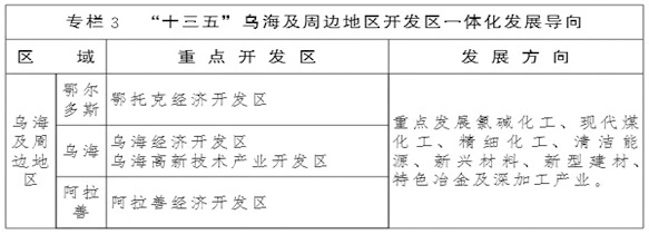 烏海及周邊開(kāi)發(fā)區(qū)。加快提升烏海及周邊地區(qū)開(kāi)發(fā)區(qū)聯(lián)動(dòng)融合發(fā)展,推進(jìn)烏斯太—烏達(dá)、千里山—蒙西、西來(lái)峰—棋盤(pán)井工業(yè)集中區(qū)建設(shè),促進(jìn)產(chǎn)業(yè)延伸、循環(huán)、耦合,聯(lián)合打造全國(guó)重要的煤焦化工、氯堿化工基地、我國(guó)西部地區(qū)重要的精細(xì)化工產(chǎn)業(yè)基地和區(qū)域生產(chǎn)性服務(wù)業(yè)中心。以阿拉善經(jīng)濟(jì)開(kāi)發(fā)區(qū)、烏海經(jīng)濟(jì)開(kāi)發(fā)區(qū)、鄂托克經(jīng)濟(jì)開(kāi)發(fā)區(qū)為重點(diǎn),加快工業(yè)集中發(fā)展,打造國(guó)家級(jí)開(kāi)發(fā)區(qū)和千億園區(qū)。