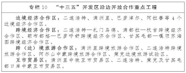 邊(跨)境經(jīng)濟(jì)合作區(qū)。貫徹落實(shí)國(guó)家和自治區(qū)加快沿邊開(kāi)放開(kāi)發(fā)的戰(zhàn)略部署,以交通干線為紐帶,以后方城市和產(chǎn)業(yè)為依托,打造邊境經(jīng)濟(jì)合作區(qū)和跨境經(jīng)濟(jì)合作區(qū),形成以外向型經(jīng)濟(jì)為核心的沿邊開(kāi)發(fā)區(qū)發(fā)展帶。以滿洲里、二連浩特兩個(gè)重點(diǎn)開(kāi)發(fā)開(kāi)放試驗(yàn)區(qū)為核心,加快推進(jìn)二連浩特—扎門(mén)烏德、滿洲里—后貝加爾等邊境(跨境)經(jīng)濟(jì)合作區(qū)建設(shè),運(yùn)營(yíng)發(fā)展好滿洲里綜合保稅區(qū),加快研究設(shè)立跨境旅游合作區(qū),努力構(gòu)建充滿活力的沿邊開(kāi)發(fā)開(kāi)放經(jīng)濟(jì)帶。